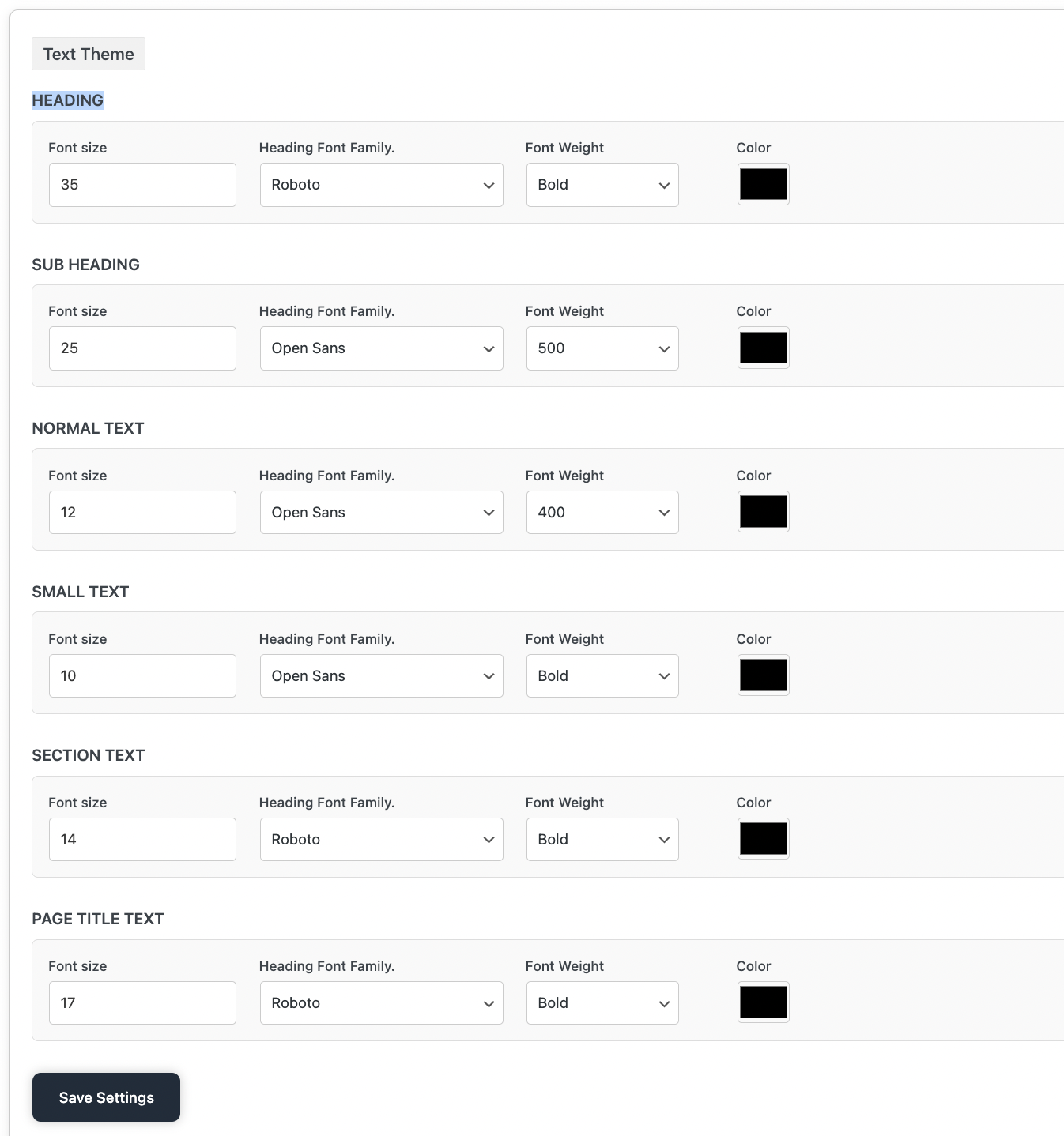 Store2App provides a flexible Text Theme system that lets you define the typography style used throughout your mobile app. Each text theme setting includes the following four customizable options: